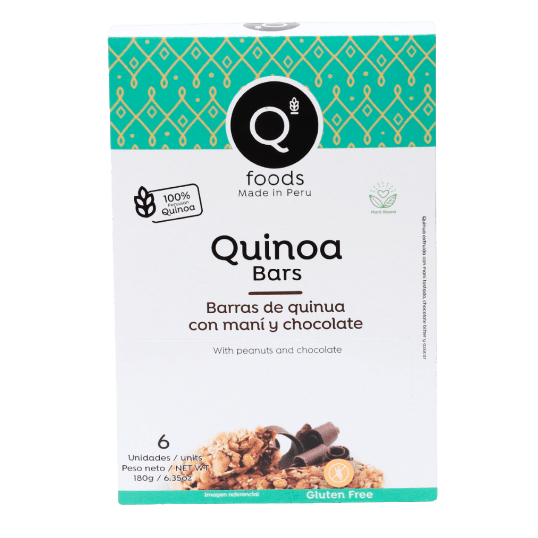 QFoods Quinoa Bar with Peanut and Chocolate 6 x 30g. Peruvian energy bar with quinoa, peanuts, and chocolate. Healthy wholesale snack with fast EU delivery.